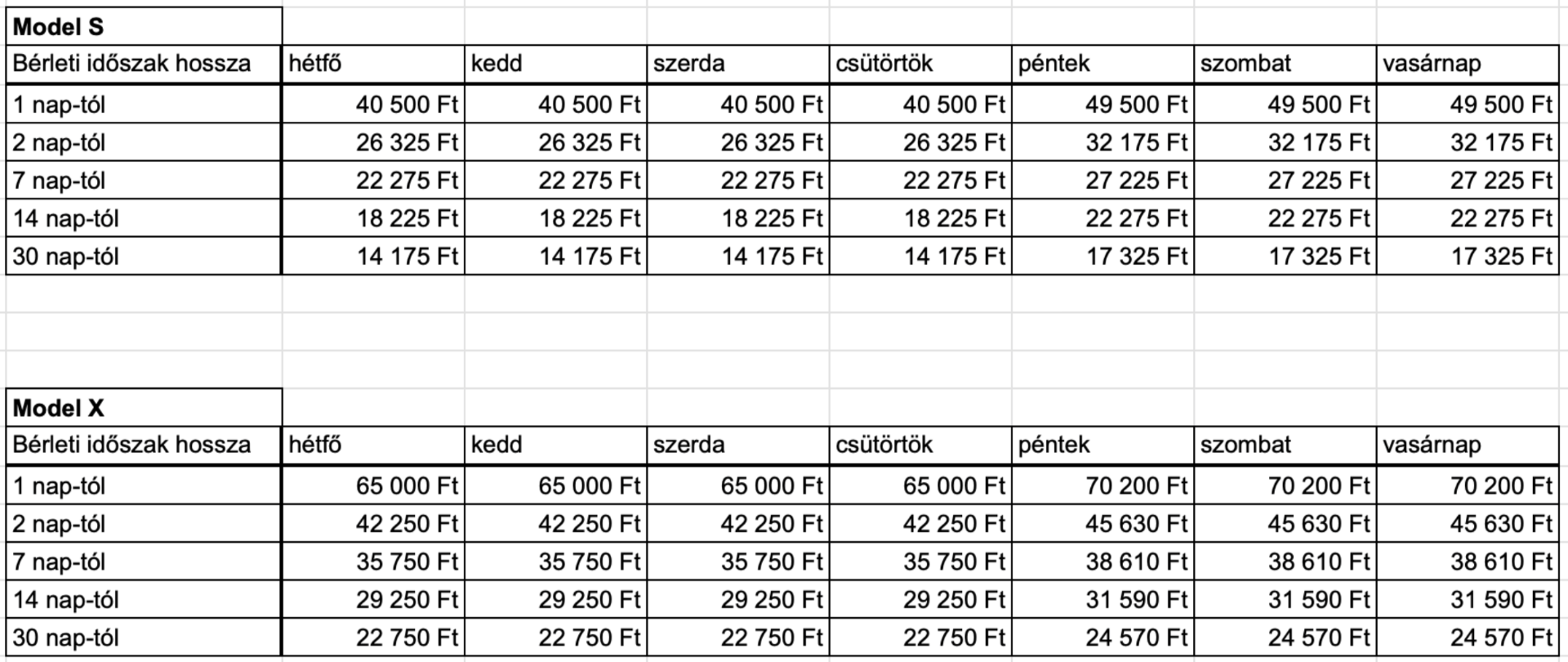 A bérleti díj a kiválasztott modell, az időtartam és a futásteljesítmény alapján változik.